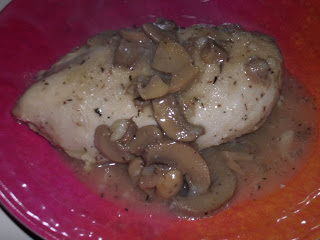 - After the chicken is cooked remove chicken from frying pan, and set aside DO NOT drain remaining ingredients in the pan. Add wine, and drained can of mushroom pieces to the frying pan. Reduce by half.
