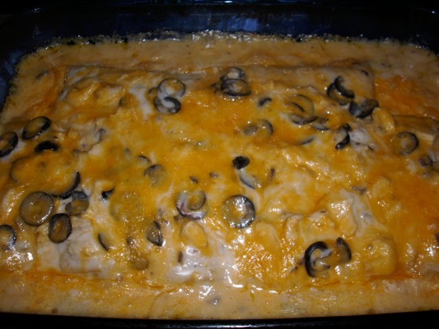 - In a medium size bowl, mix together milk, soup, 1 cup of the cheese, and the olives