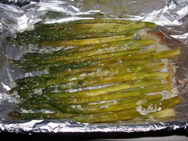 - Place asparagus on foil-lined baking sheet and drizzle with olive oil.