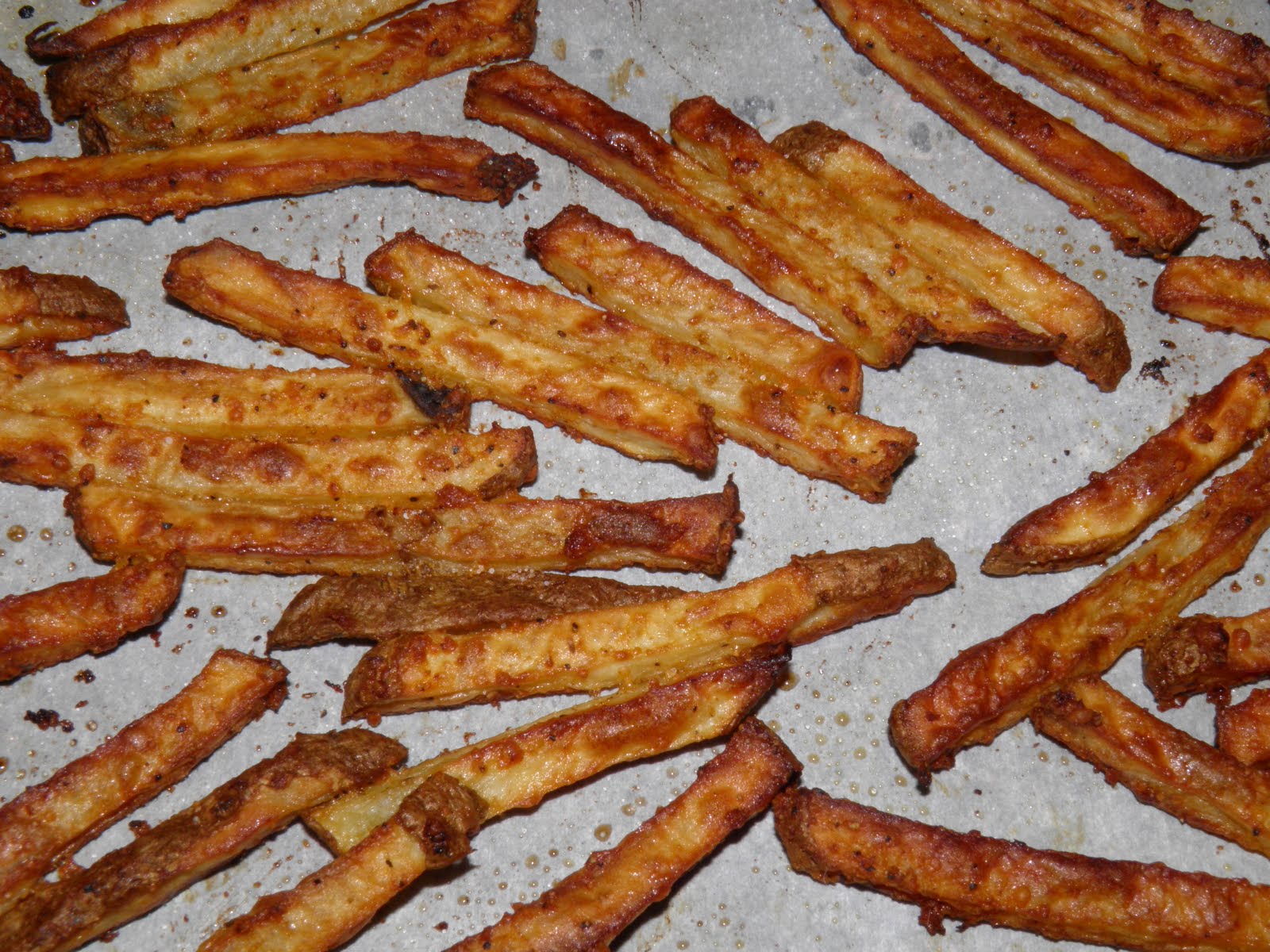 This is a simple recipe that comes out like fried french fries, but with less fat, and less work. I really like how simple it is, and the flavor is great too. To my surprise, the fries came out nice and crunchy, but fluffy inside. I was a little afraid of how the parmesan cheese would taste on the fries. I thought the cheese would be overwhelming, but to be honest you don’t really notice the cheese at all. The flavors mingle well. I would say to watch your cooking time. It really will depend on the thickness of your fries. I use a veggie cutter, so my fries for the most part are uniform.