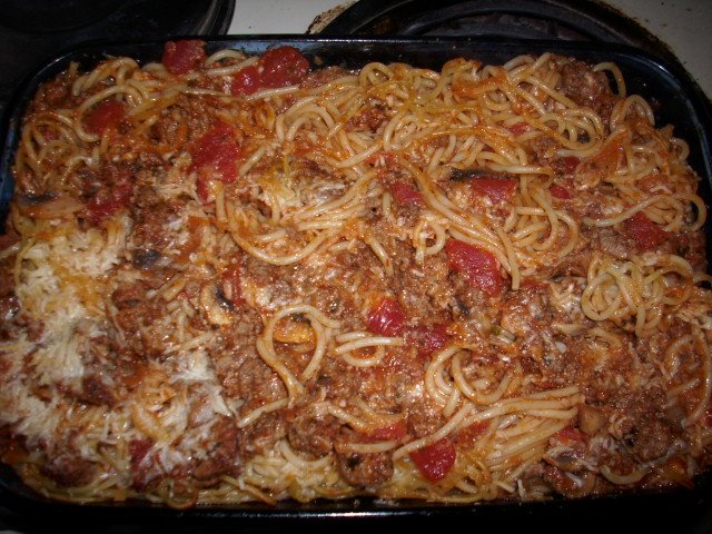 If you are in a pinch for time or money this recipe fills the bill. When I make a meat spaghetti sauce I save what’s left over an keep it in the freezer. When time or money are running short this makes a great meal in just a short amount of time. It may not be very visually appealing, but the taste is great!