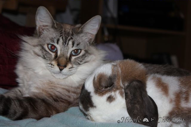 First off Cody has an identity crisis, and thinks he’s a cat. He does not live in a cage, in fact he sleeps under a table at night. He has free range of the house and uses the little box just like the cats. He is 7 years old and has outlived any other rabbit I have had in the past. I believe it’s because he is never caged, and the cats keep him on his toes. He does love his kitties!