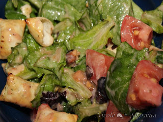 - Chop the remaining 3 tomatoes. Add the tomatoes, romaine and croutons to the bowl with the dressing; toss to coat. Sprinkle with bacon.
