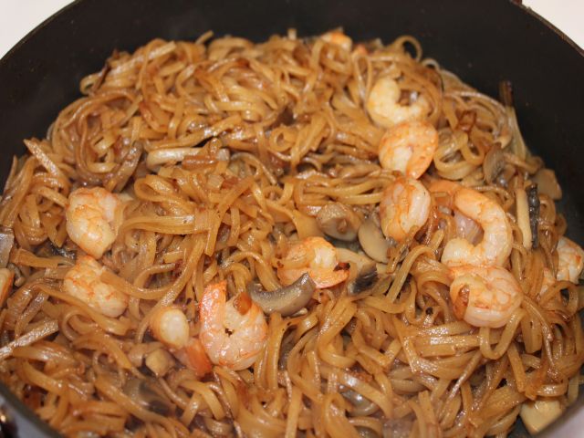 - Add mushroom, shrimp, sesame oil, sugar and soy sauce cook for about 5 minutes or until the shrimp are cooked then add drained rice noodles