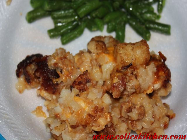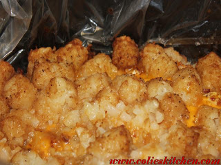 - On top of the tots add ¼ cup of bacon bits and ¾ cup of cheese.