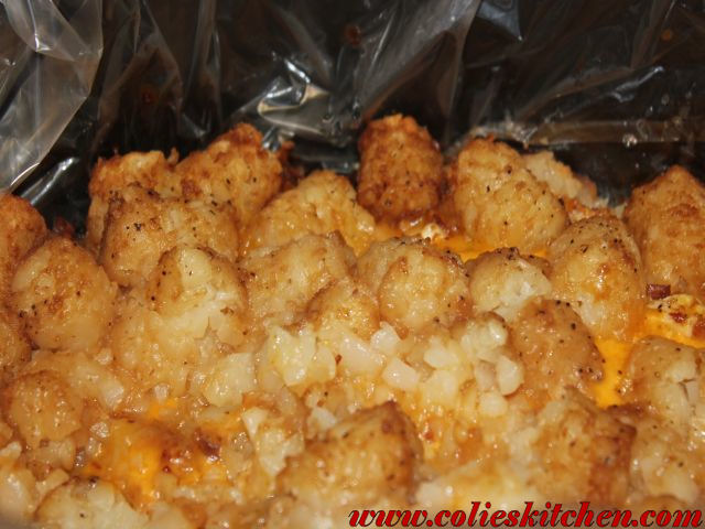 - To the slow cooker add ½ of the bag of frozen tater tots