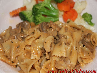 - Add wine; bring to a boil, reduce heat, and simmer 4 minutes. Remove from heat; let stand 30 seconds. Stir in sour cream; add noodles, mix well and garnish with parsley if desired and cook until noodles are cooked through and tender.