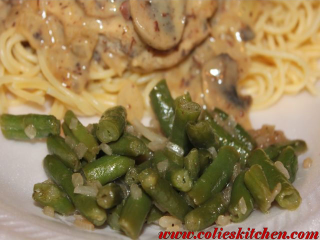 - Once you are at half the liquid add green beans, cover and simmer until the green beans are tender and your liquid thickens.