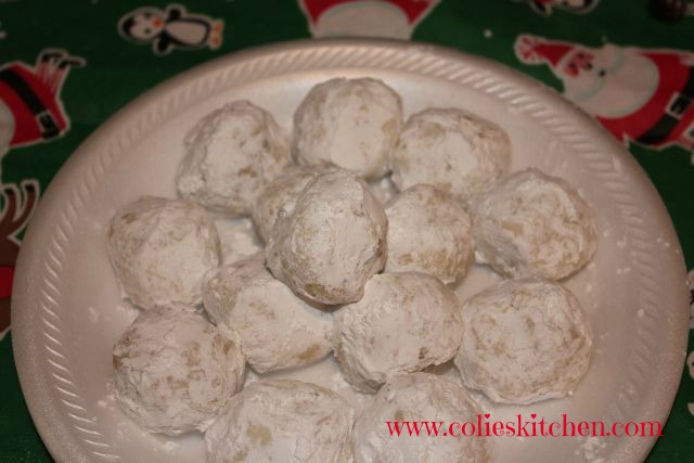 - Remove the cookies from the baking sheets and roll in powdered sugar while still hot. Cool on wire racks and roll cookies again in powdered sugar before serving.