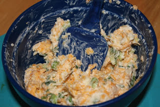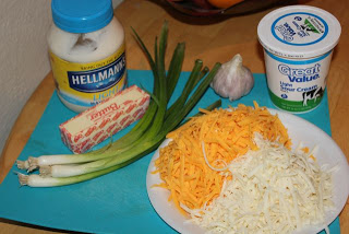 - In a large bowl, mix together the cheeses and the green onion. Stir in the mayonnaise and sour cream. In a separate small bowl blend the butter and garlic until smooth. Add the butter mixture to the cheese mixture.