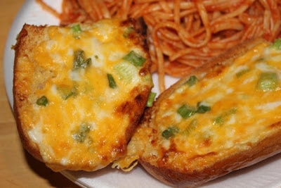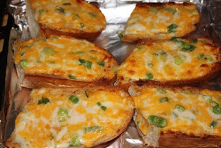 - Preheat broiler. Slice loaf of bread in half horizontally, lay crust side down. Spread cheese mixture over the bread. Place under the broiler until nicely browned, about 3 to 5 minutes.