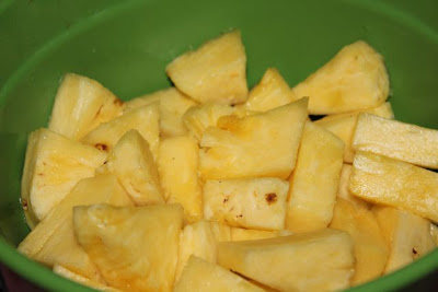 - Cut the top and the bottom off the pineapple then remove the outer skin of the pineapple and remove the core.