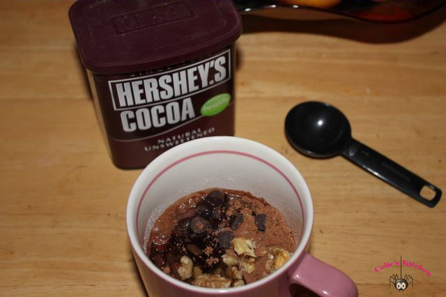 Oh this recipe is sooo good! It’s easy and it’s great to make because you eat it, and it’s gone. When you are trying not to over eat on goodies the last thing you want to have hanging around is a big pan of brownies. This is great because you can make it when you want it, then you eat it! It’s also great because it’s a personal size, fresh, and you can add anything you want to make it even better.