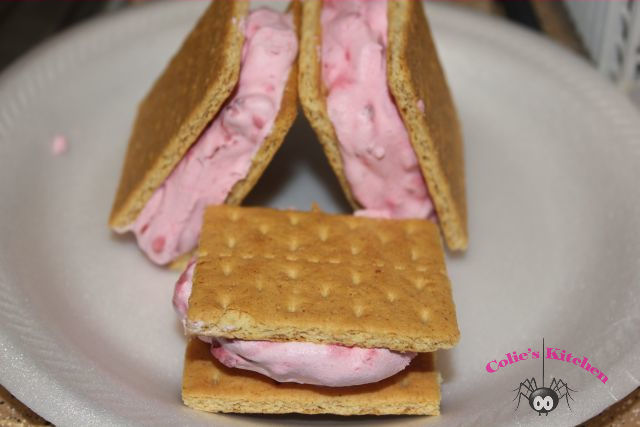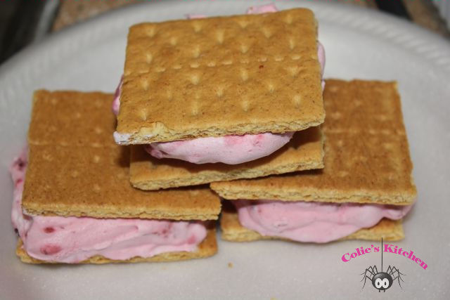 - Break each graham cracker into two pieces down the middle until you have a top and a bottom for your ice cream sandwich. Using a spoon add a large blob of your cool whip berry mixture to one side of the graham cracker. Because I was trying to keep the calorie count on these I measured each graham cracker with ¾ ounce of filling.