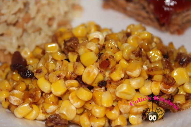 - Turn the heat up to medium high and fry the corn until the corn begins to brown and get a bit crisp.