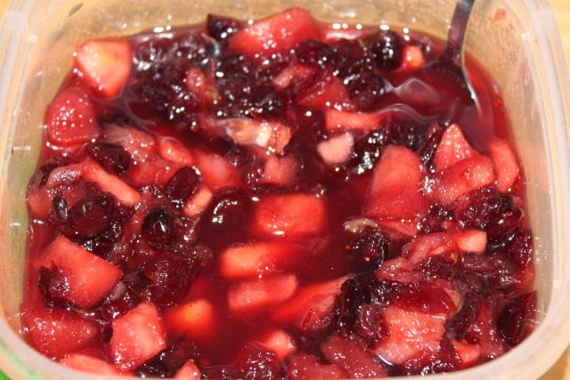 - In a medium saucepan over medium heat, add the cranberry juice, orange, cranberries, cinnamon and sugar. Bring to a boil and let cook for 5 minutes. Add the apples and cook, stirring occasionally, until the cranberries have softened and apples are tender, about 5 minutes.