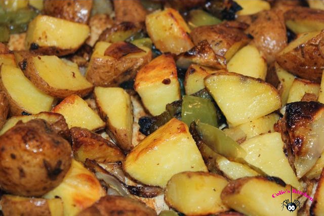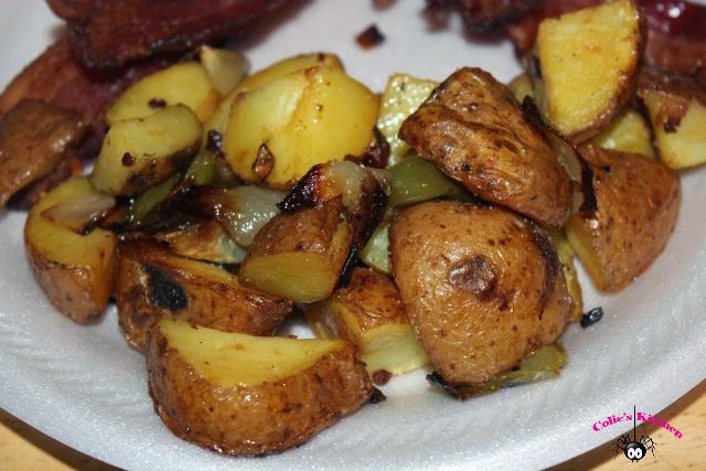 - In a large bowl, toss together the potatoes, garlic, onion, green bell pepper, oil, butter, seasoned salt, salt and pepper.