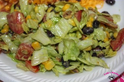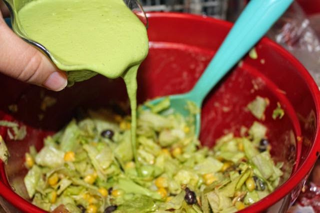 - To assemble the salad, place romaine lettuce in a large bowl; top with tomatoes, corn, black beans and cilantro. Pour the dressing on top of the salad and gently toss to combine. Stir in avocado.