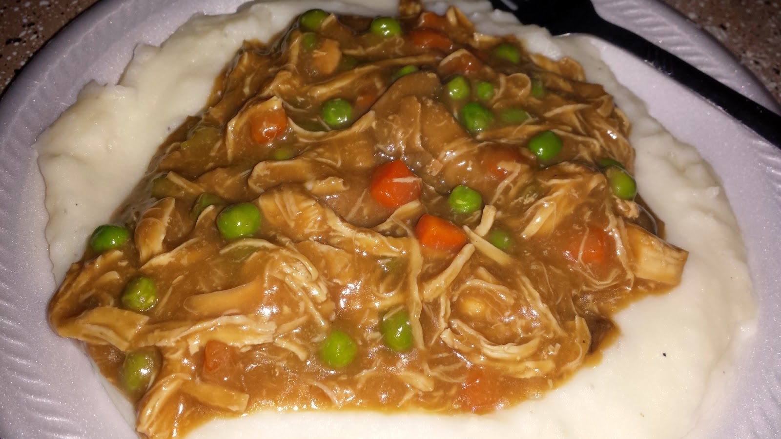 - Shred chicken breast in the pot then add 1 cup of frozen peas and carrots mix well then recover the pot. Cook for another 2o minutes.