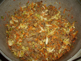 - Brown beef, cabbage, green onions, garlic and carrots in a large skillet