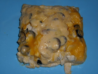 - In a medium size bowl, mix together milk, soup, 1 cup of the cheese, and the olives