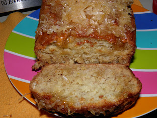 This is a fun variation of a banana bread recipe. Banana definitely takes a back burner to the citrus flavors. The lime, lemon, and the rum, are the flavors that pop out. The brown sugared coconut on top complete this bread.